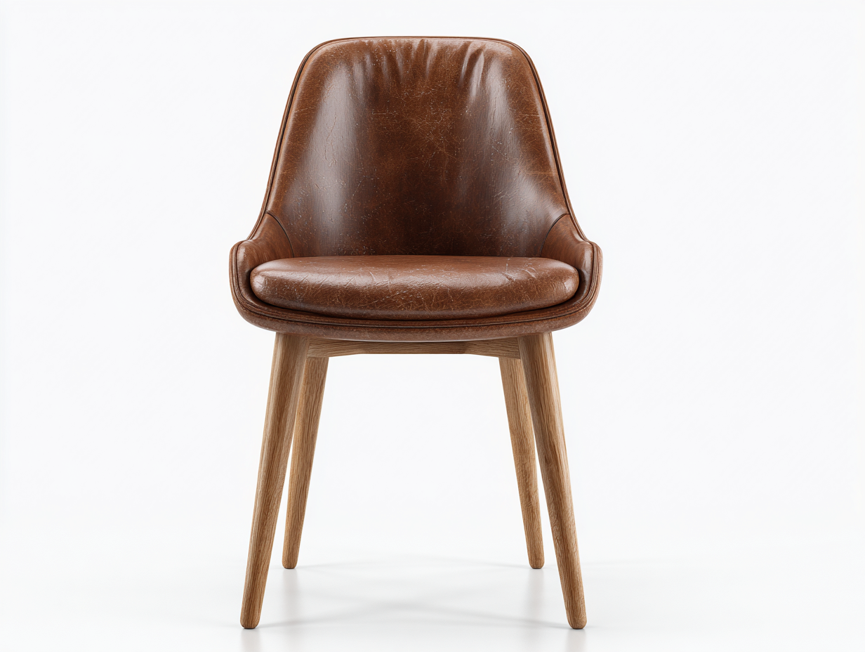 Die Sitzfläche ist mit glattem Leder bezogen und sorgfältig verarbeitet. Die Beine bestehen aus massivem Holz mit natürlicher Oberflächenstruktur und sorgen für einen sicheren Stand.