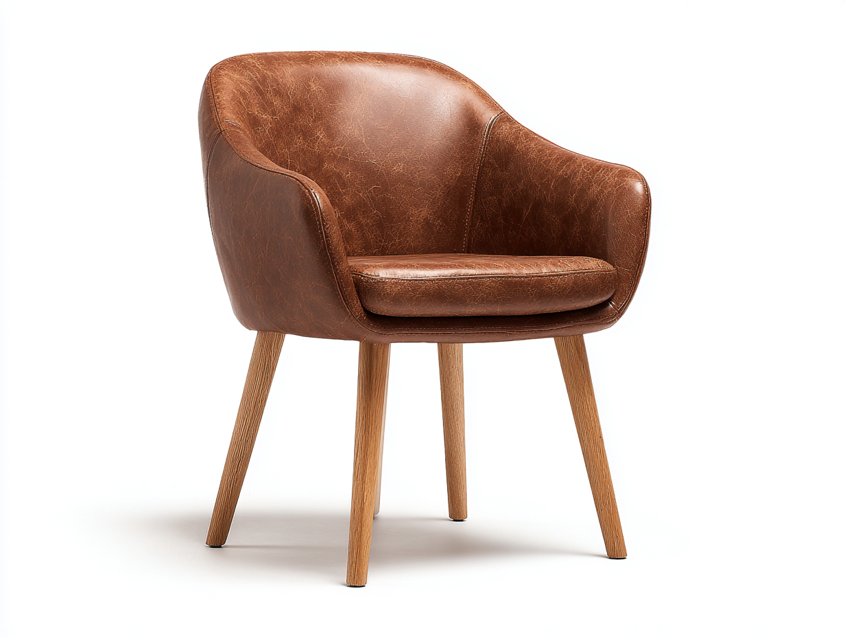 Die Sitzschale ist mit einem Bezug in Lederoptik in Braun versehen und sorgfältig verarbeitet. Stabile Holzbeine in Holzfarbe sorgen für einen sicheren Stand und unterstreichen den natürlichen Charakter des Stuhls.