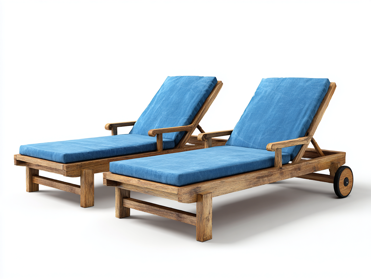 Die Liegen bestehen aus einer robusten Holzkonstruktion in Holzfarbe. Die Liegeflächen sind mit strapazierfähigen Auflagen in Blau ausgestattet. Alle Oberflächen sind sorgfältig verarbeitet und für den Einsatz im Außenbereich geeignet.