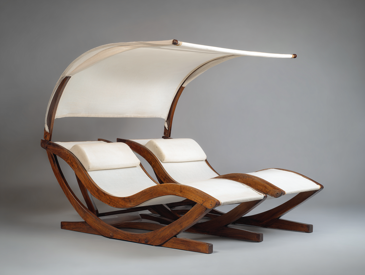 Diese Garten Doppelliege ist für den Einsatz im Außenbereich konzipiert und bietet zwei großzügige Liegeflächen unter einem schützenden Sonnendach. Die geschwungene Form sorgt für eine entspannte Atmosphäre im Garten.