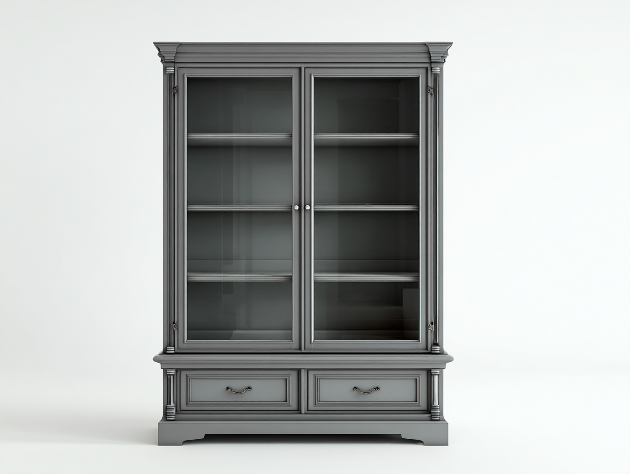 Der Korpus ist in grauer Ausführung gehalten und sorgfältig verarbeitet. Die Front besteht aus Glaselementen, die eine gute Sicht auf den Innenraum ermöglichen. Die Konstruktion ist auf Stabilität und Alltagstauglichkeit ausgelegt.