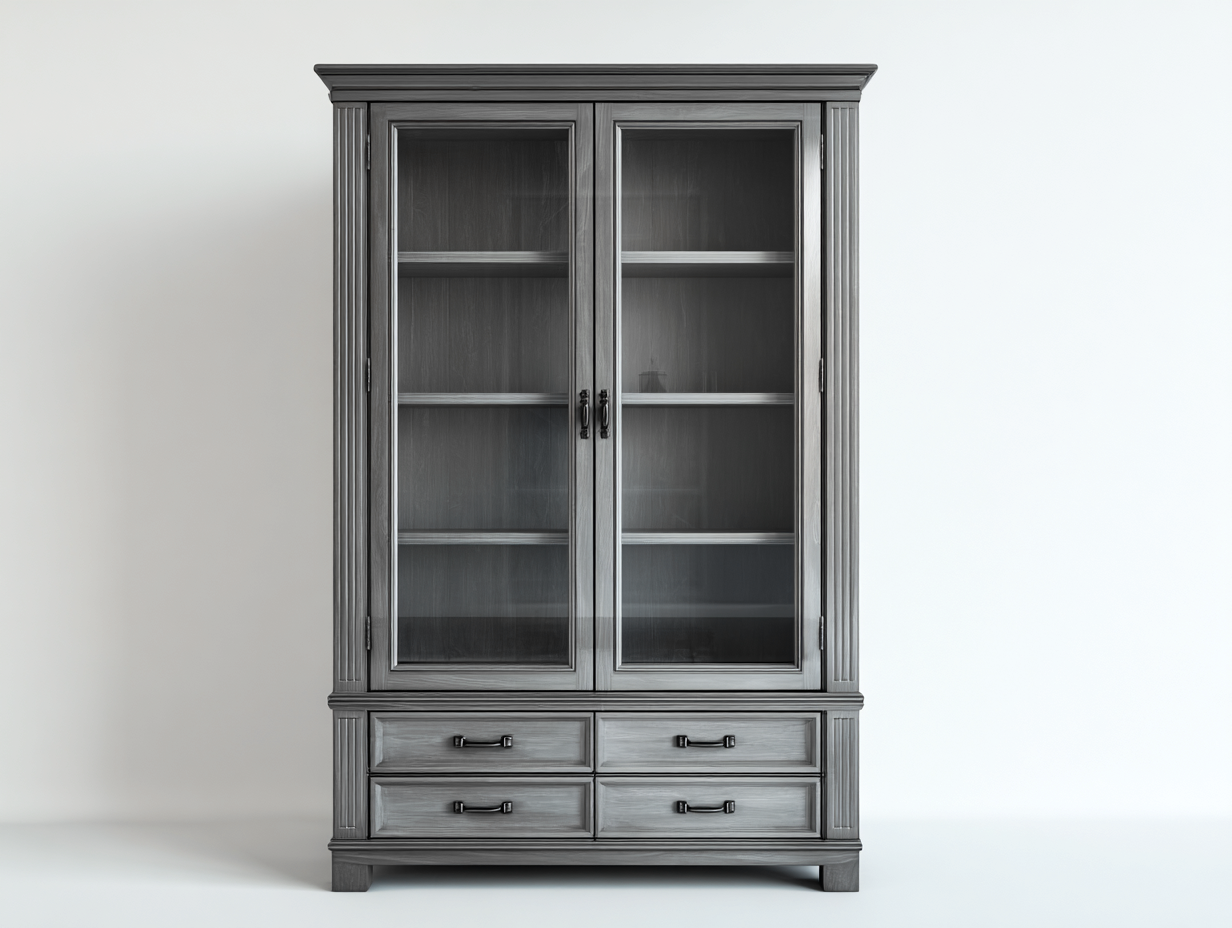 Der Korpus besteht aus einer stabilen Holzkonstruktion in Grau. Die Glastüren ermöglichen eine übersichtliche Präsentation des Innenraums. Die Oberflächen sind sorgfältig verarbeitet und auf den täglichen Gebrauch ausgelegt.