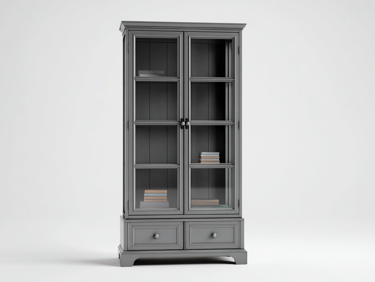 Die Vitrine besteht aus robustem Holzwerkstoff in grauer Ausführung. Die Glastüren sind sauber eingefasst und ermöglichen eine übersichtliche Präsentation des Innenraums. Die Verarbeitung ist auf Stabilität und Langlebigkeit ausgelegt.